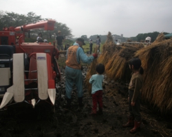 乾いた稲を受け取って子どもたちも脱穀機へ持ってゆき、脱穀体験をしました。