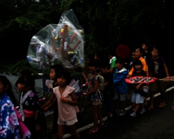 夏のはじめに行ったキャンプでの経験を元にしてつくったお神輿をみんなで担いでお祭りが始まります。
