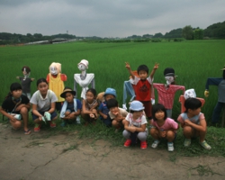 それぞれ古着やタオルなどを持ち寄って、思いおもいにかかしをつくり田圃に立てました。